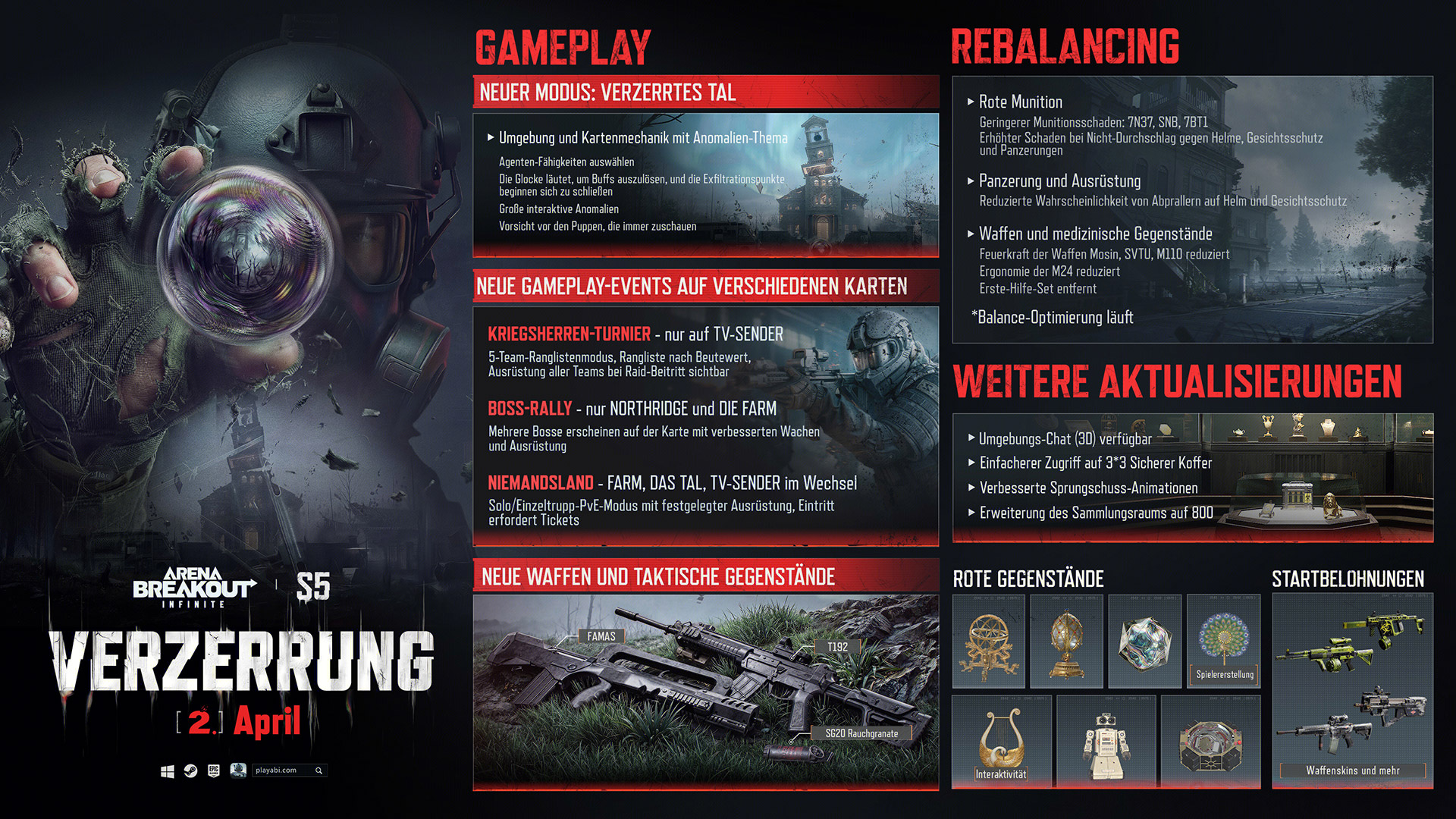 Arena Breakout: Infinite bietet Waffennarren das Ultimative Büchsenmachersystem. Mit dem Start von Saison 5 erweitern wir dein Arsenal um die brandneuen FAMAS und T192. Wähle aus über 75 Waffen und 900 Waffenmodifikationen für mehr als 20 Slots, um dein ultimatives taktisches Meisterwerk zu erschaffen.